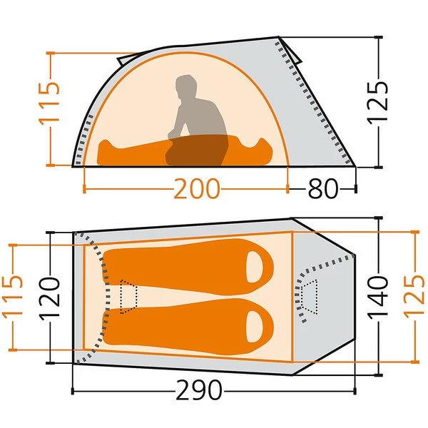 Das Innenzelt ist großzügig geschnitten. Mit einer Höhe von 115 cm kannst du bequem sitzen und anziehen. In der Apsis ist Platz um dein Gepäck zu lagern. Ist man alleine unterwegs, ist im Innenraum auch genügend Platz für große Rucksäcke.