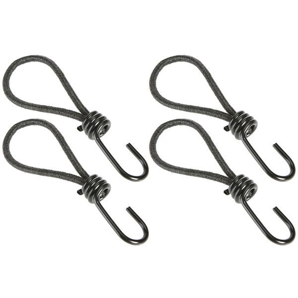 Vier stabile Spannhaken mit 6 cm langer Gummischlaufe und Metallhaken. Sie eignen sich zum Abspannen großer Zelte und Vorzelte, aber auch zum Sichern von Abdeckplanen. Inhalt: 4 Stück.